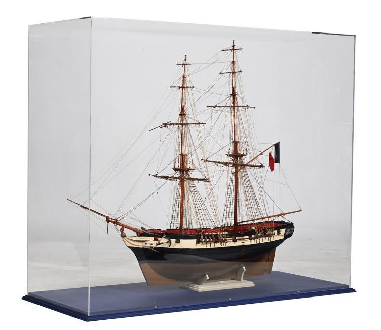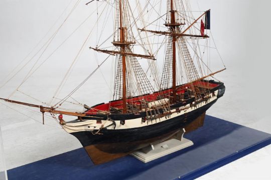A FULLY RIGGED STAINED AND PAINTED WOOD MODEL OF A TWO MASTED 19TH CENTURY TRADING BRIG 20TH CENTURY With bound masts and bowsprit, standing and running rigging, the hull finished in black and white with figurehead and anchors the case 101.5cm high, 122cm wide Provenance: The David and Rose Rowse collection