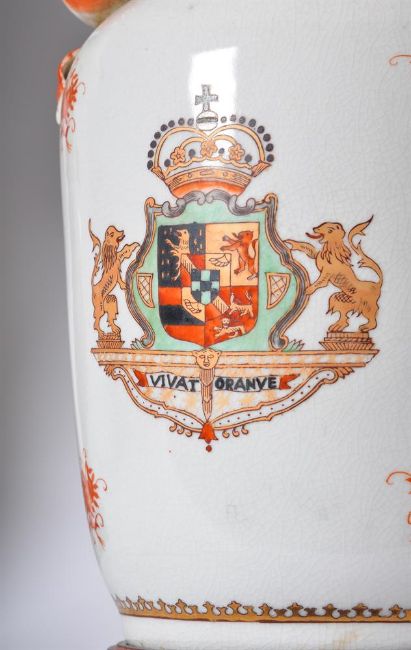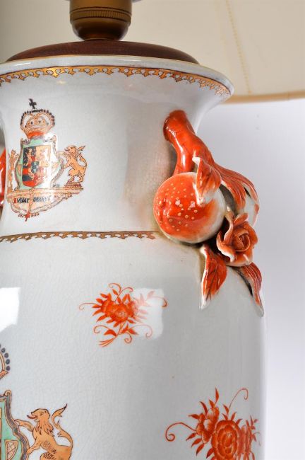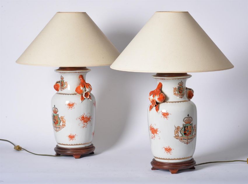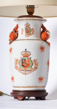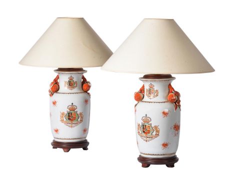 A PAIR OF BALUSTER LAMPS WITH CRESTS ON STANDS 20TH CENTURY 'vivat oranye' and crest, with shades 65cm high with shade, 49cm to bulb socket, 20cm diameter Provenance: Private Collection, Lancashire Estate Condition Report: PLEASE NOTE: ALL LOTS ARE LOCATED AT SACKVILLE WEST STORAGE IN ANDOVER (SP10 3SA) AND ARE NOT AVAILABLE TO VIEW.With wear, marks, knocks and scratches as per age, handling, use, and cleaning Some glazing spots and surface discolouration Some minor chips Crazing throughout ADDITIONAL IMAGES: Please 'Ask a Question' to request additional images for this lot.Condition Report Disclaimer