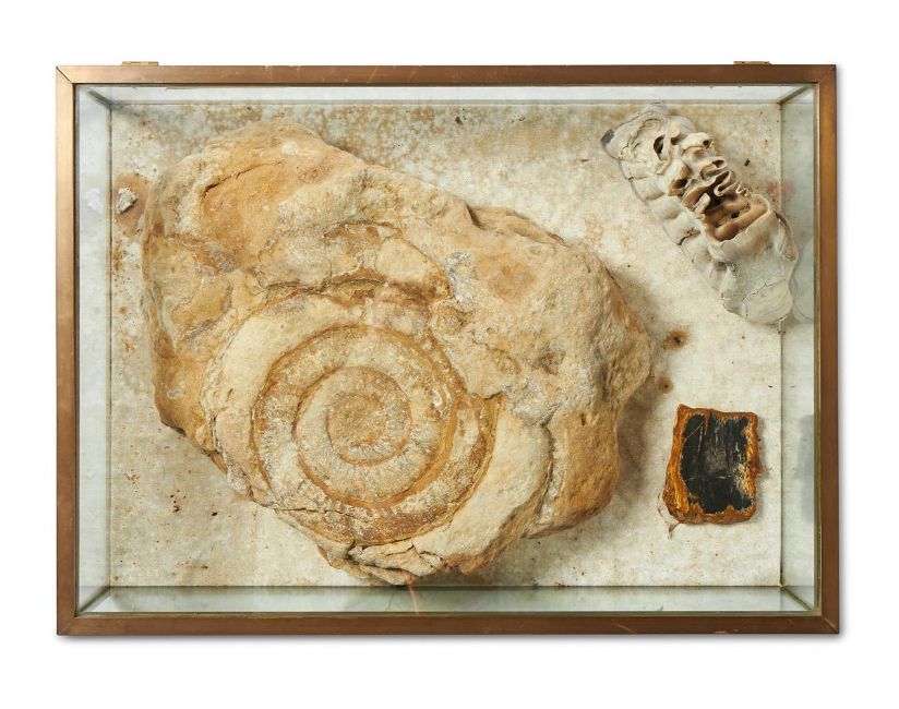 AN AMMONITE, A FOSSILISED TREE FERN AND A MAMMOTH'S TOOTH Contained in a modern glazed brass display case with hinged top The case 19cm high, 55cm wide, 40cm deep