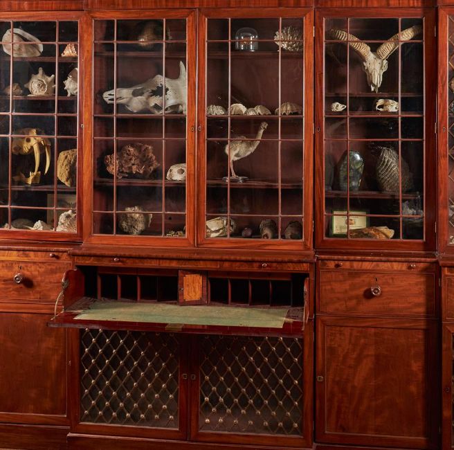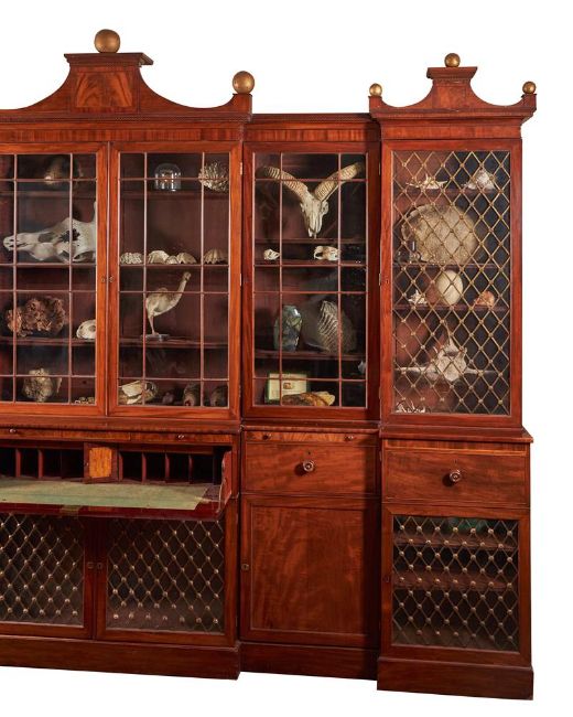 A MAHOGANY BREAKFRONT SECRETAIRE LIBRARY BOOKCASE ENGLISH, EARLY 19TH CENTURY AND LATER The upper section with six glazed doors, the lower with six panelled doors and a fitted secretaire drawer 280cm high, 380cm wide, 54cm deep   Condition Report: Please note the contents that is visible in some images is NOT included as part of the lotMarks, knocks, scratches, abrasions consistent with age and useSplits and cracks, chips and losses, some joints opening Some signs of alterations and adaptions, the outer elements now with grilled doors, the glazing here later too, there is some infilled mouldings to the beaded edges to hide where the previous astragals had sat, the gilt spheres to the central section also appear to have be replacements - the gilding here certainly fresher than the outer elements. Elements screwed together for security - they will need to be secured for future installationPlease see additional images for visual reference to condition   Condition Report Disclaimer