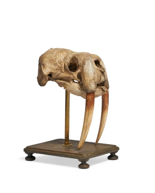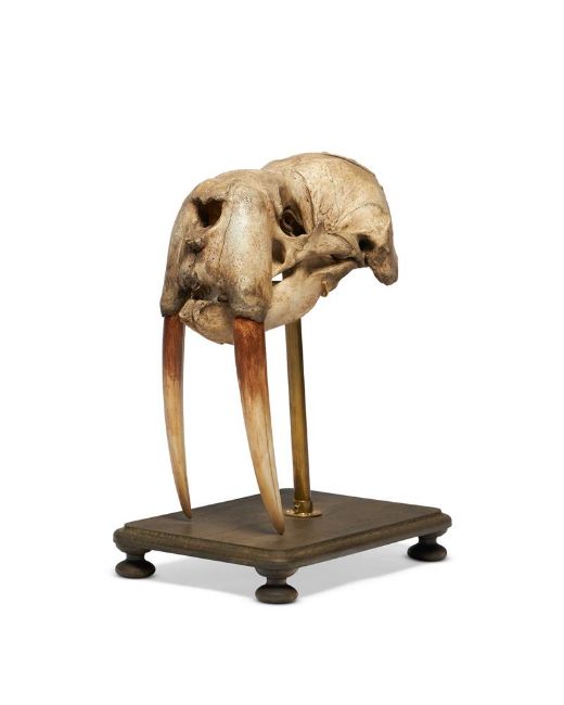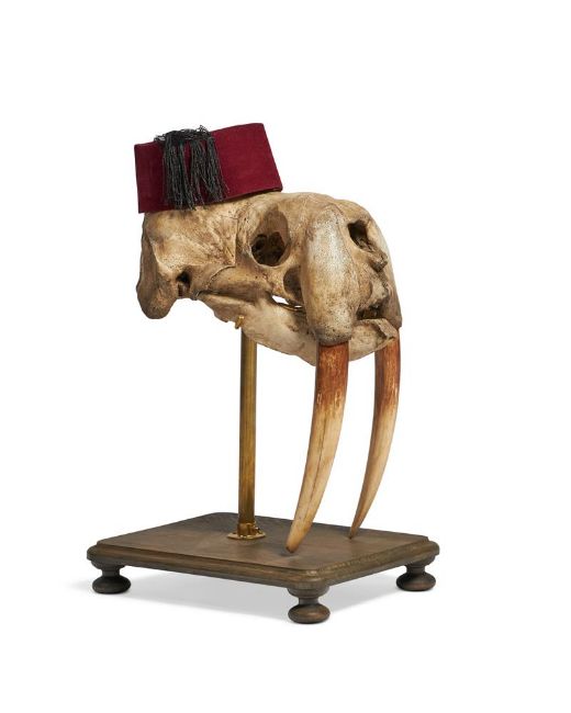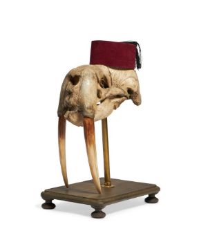 Y A WALRUS (ODOBENUS ROSMARUS) SKULL On a modern wooden base 49cm high, 35cm long Condition Report: The Fez is balanced upon the skull and not attached, it can easily be removed if wished, likewise the skull is removable from the stand base, it sits nicely upon its cradle and is solid and stably supported Presentable order overall with the expected discolouration to the skull - there is some bone pitting, cracks, growth lines, the cheek bones beneath the eye sockets are loose but are still attached to the skull at time of report , the teeth have a laquered appearance, with a darker upper section - this can be seen in the catalogue and online imagesPlease see additional images for visual reference to condition and appearance Condition Report Disclaimer