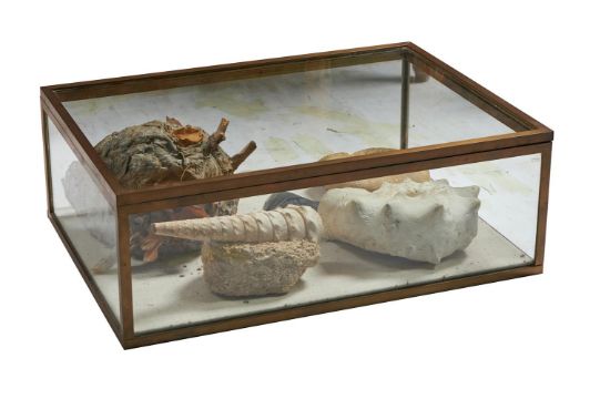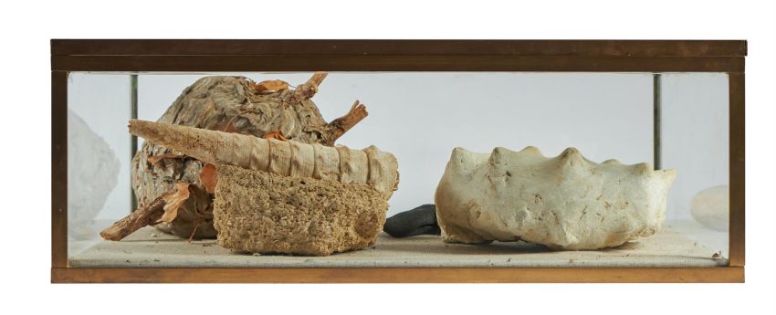 TWO AMMONITES (CEPHALOPODS), A CAMPANILE GASTROPOD GIGATEUM FOSSIL, A MIOCENE 'MEGALODON' FOSSIL SHARK TOOTH AND A WASP'S NEST Contained within a modern glazed brass display cabinet with hinged top The case 19cm high, 55cm wide, 40cm deep