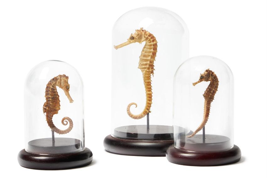 THREE SEAHORSES (HIPPOCAMPUS) Under glass domes 15cm high overall and smaller Condition Report: The smallest specimen is loose from its base, it will need putting carefully in place, probably best if possible to remove all from bases for careful transportation as these creatures are fragile, each with holes to the tails for the mounting on the stands, protective glass domes all removable and all intact Please see additional images for visual reference to condition Condition Report Disclaimer