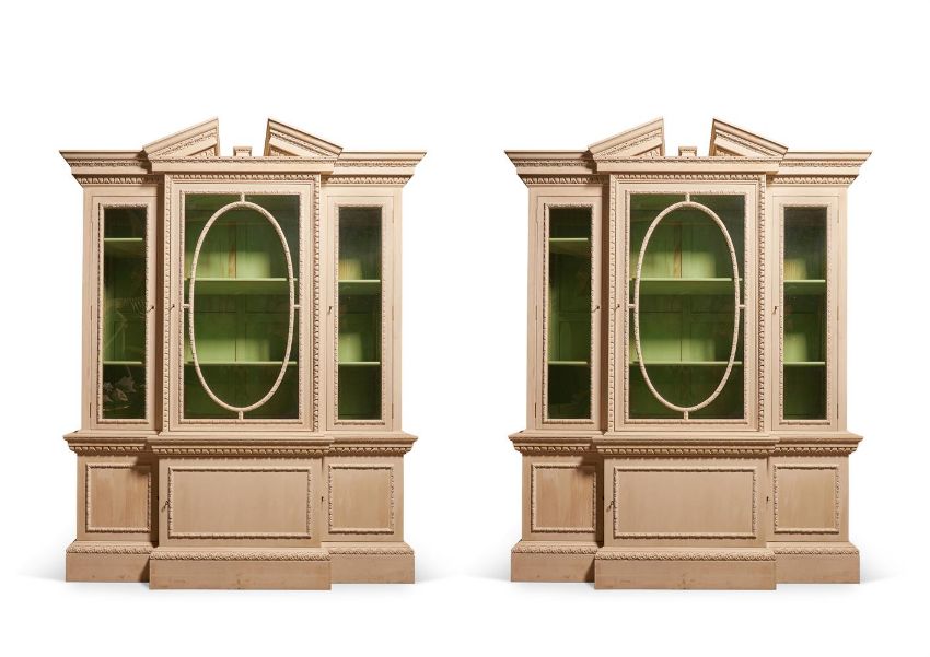A PAIR OF GREY PAINTED 'HALLET' BREAKFRONT BOOKCASES MODERN, BY A MODERN GRAND TOUR With three glazed doors surmounted by a broken pediment 246cm high, 198cm wide, 54cm deep    Condition Report: As catalogued these are of recent manufacture and the overall general condition and appearance reflects this, The painted surfaces with some uneveness, possibly to give the impression of age, all locks have keys at time of report, some light marks, knocks, scratches, abrasions consistent with use in a domestic setting Overall solid and stableOne with a vertical crack to the central lower door panelPlease see additional images for visual reference to condition and appearance  Condition Report Disclaimer