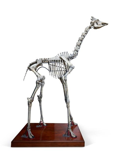 JAMES PERKINS STUDIO THE MODEL 485 x 216cm (190¾ x 85 in.) James' The Model is an extraordinary and thought-provoking piece that explores both the whimsical and the surreal. At its core, the sculpture presents the skeletal form of a giraffe, meticulously crafted to capture the elegance and grandeur of this magnificent creature. The giraffe's towering frame, with its long, slender legs and delicate bones, is a striking representation of fragility and grace. However, what sets The Model apart is the artist's unique vision: the giraffe's skeletal structure is paired with a pair of high-heeled shoes in the unmistakable style of Christian Louboutin, complete with their signature red-lacquered soles. These heels, often associated with glamour and luxury, are juxtaposed against the raw, skeletal form of the giraffe, creating an unexpected yet compelling contrast. This playful yet thought-provoking combination evokes James' long-standing observation that giraffes appear to be perpetually standing on their tiptoes. By incorporating the Louboutin heels, the artist brings this idea to life, presenting the giraffe in an exaggerated, almost human-like pose. The result is both humorous and poignant, highlighting themes of beauty, fragility, and the often absurd fusion of nature and luxury.■ After the sale this lot will remain at Parnham Park, Beaminster, DT8 3LZ where it will be available for collection