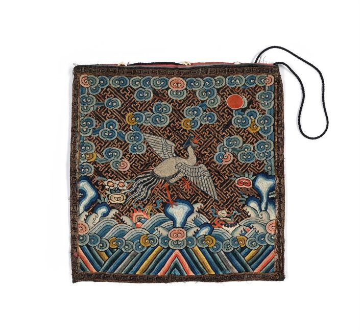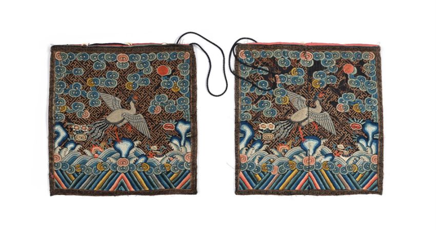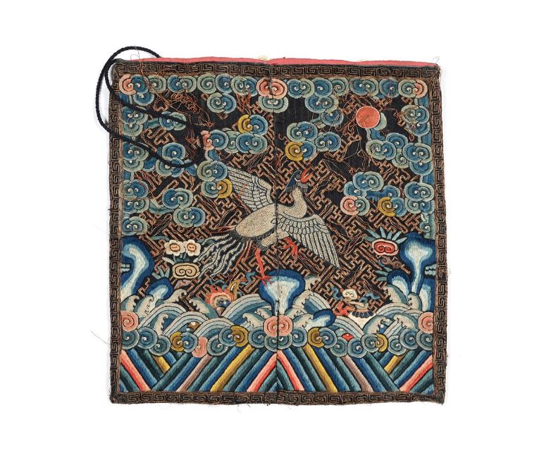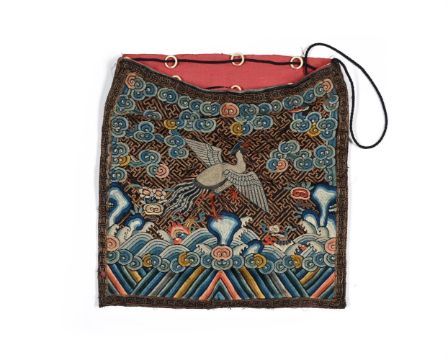 A pair of Chinese silk 'silver pheasant' rank badges, Qing dynasty, circa 1890, representing the fifth civil rank, each with central silver pheasant in flight, with cloud scrolls and Buddhistic emblems all above cresting waves, within a blue and gold wire key fret band, 29cm high x 28.5cm (2)Provenance:Private Family collection by inheritance 晚清 緞繡五品文官補子一對(後改為挎包)拍品來源:英國私人收藏 Condition Report: the colours quite fresh but with some loose gild threads throughout and overall slight fading and now adapted as a bagCondition Report Disclaimer