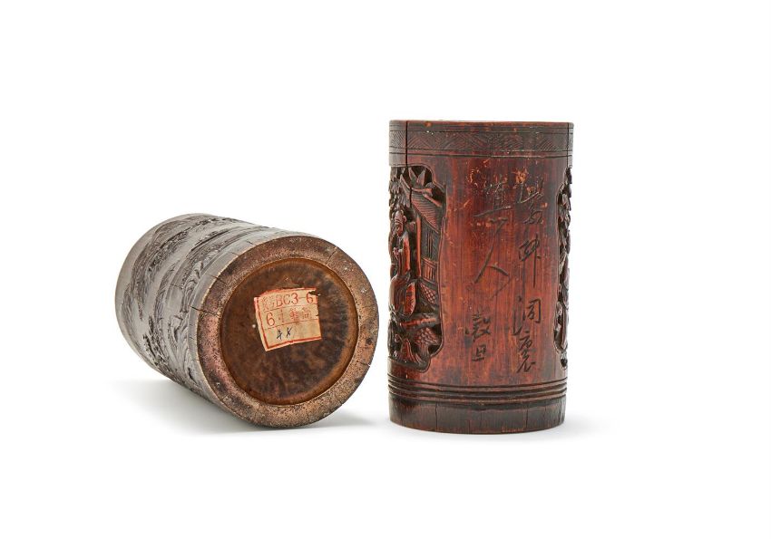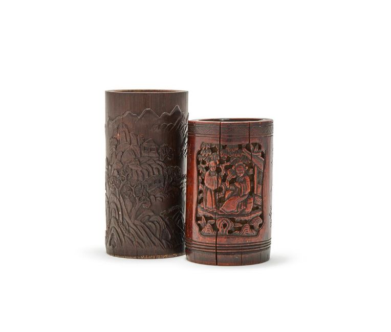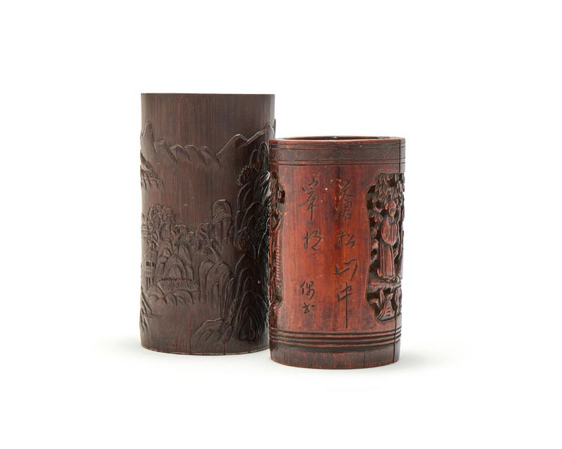 A Chinese carved bamboo brushpot with landscape scene, 19th century, 15.3cm high; and a Chinese bamboo inscribed brushpot, 19th century, 12.3cm high (2)晚清 竹雕筆筒兩件 Condition Report: cracks commensurate with agesmall one with chips to the rimCondition Report Disclaimer