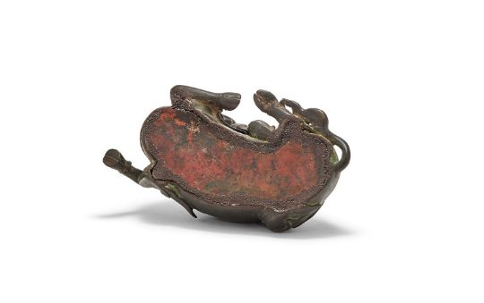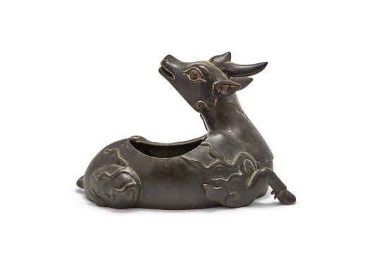 A Chinese bronze model of a Kylin, 17th century, 20cm long x 13cm high, 1303 gramsProvenance:  The property of a Gentleman and by family descent 明 銅犀牛望月鏡架(克重1303g)拍品來源:英國私人紳士收藏  Condition Report: the cover that once held the mirror support now missing and casting flaws with two holes to neck and base plate probably an old replacement Condition Report Disclaimer