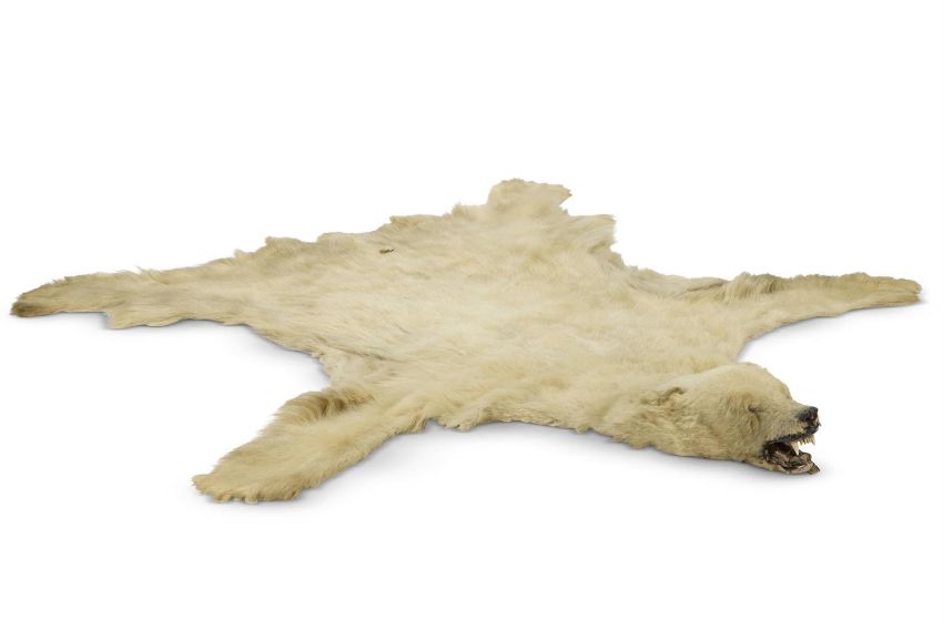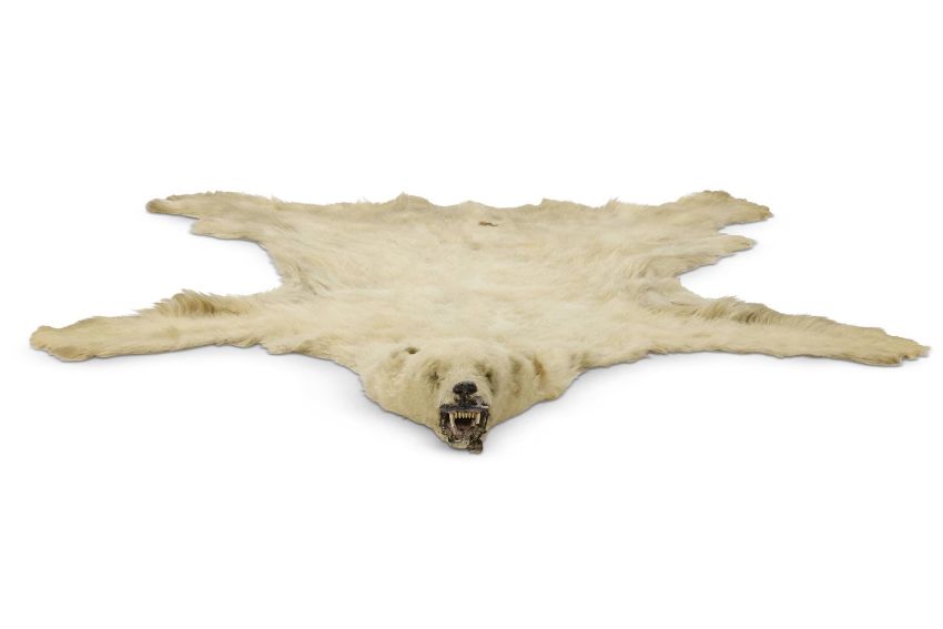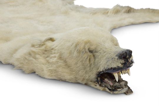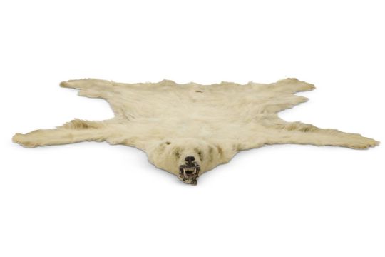 Y A POLAR BEAR (URSUS MARITIMUS) SKIN RUG AND PRESERVED HEAD LATE 19TH CENTURY With naturalistically modelled head and mouth parts, approximately 230cm longLiterature: Illustrated 'Powderham Castle', Country Life, July 27th 2017, in the State Bedroom Condition Report: Poor condition generally. Mouth damaged. Country house condition reflected in the Estimate.Condition Report Disclaimer