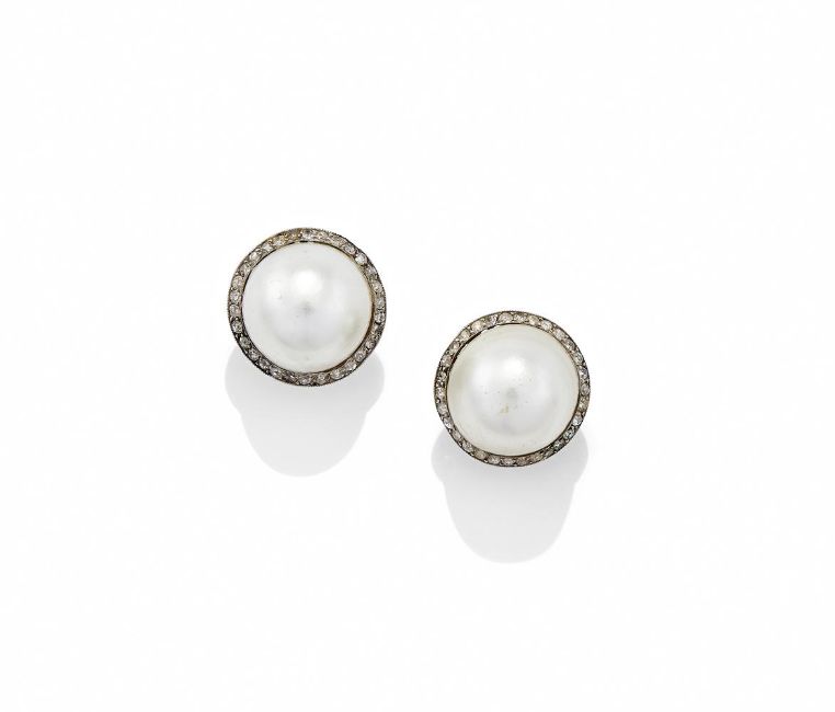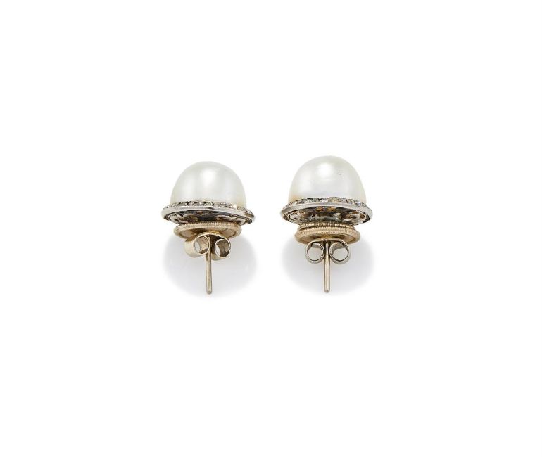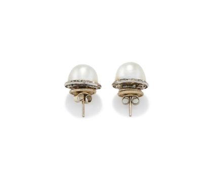 A PAIR OF MABÉ PEARL AND DIAMOND EARRINGS Each mabé pearl within an old single cut diamond surround, post fittings Size/dimensions: 1.5cm long Gross weight: 9.7 gramsProvenance: From the estate of an English Private Collector Condition Report: One earring back panel deficient, solder residue visible. Possibly converted from clip fittings. Pearl cement visible through back. All diamonds present and correct. One surround slightly dented. Pearls with good lustre, some unevenness to nacre.Condition Report Disclaimer