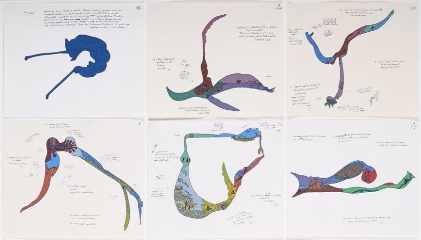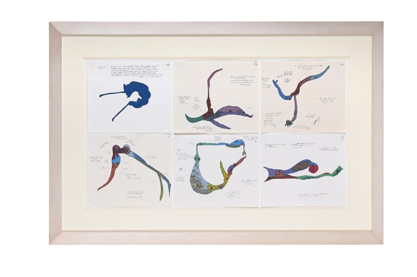 λ ÖYVIND FAHLSTRÖM (SWEDISH 1928-1976) 6 ELEMENTS FOR 'NIGHT MUSIC 2' Ink and acrylic on paper, six sheets framed as one Each sheet variously inscribed Overall 39 x 71cm (15¼ x 27¾ in.)Executed in 1975.Provenance: Arnold Herstand & Company, New York Aurel Scheibler, Cologne Condition Report: Executed on six separate sheets, all mounted framed together. Three of the sheets are noticeably discoloured throughout, in particular the middle drawing on the top row which also has some staining to the upper left corner. The sheets all have varying degrees of handling creases and some with small losses or tears to the extreme edges. Please see the high resolution images for further clarification. Unexamined out of glazed frame.Condition Report Disclaimer