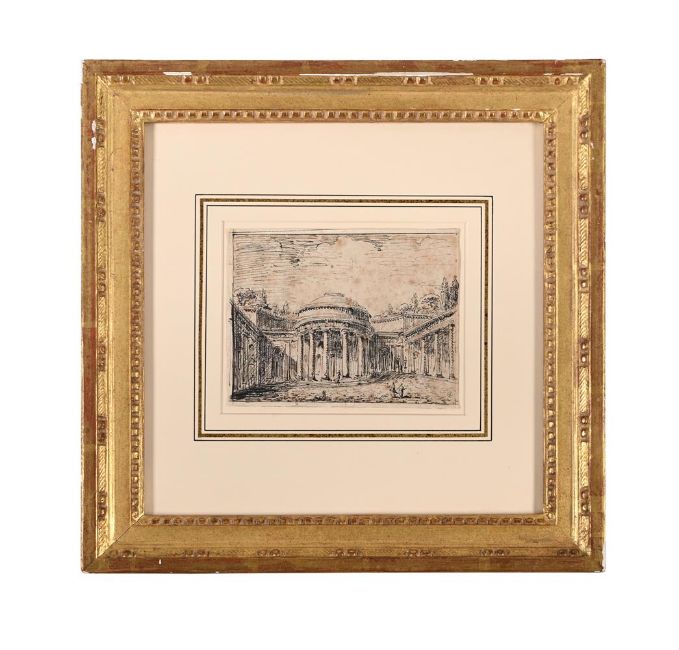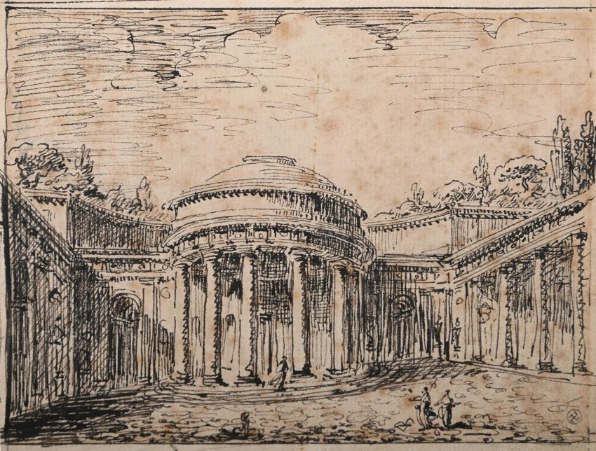 ITALIAN SCHOOL (18TH CENTURY) ARCHITECTURAL CAPRICCIO Pen and ink Inscribed with a device (lower right) 11.5 x 15cm (4½ x 5¾ in.) Provenance: Charles Molinier (1845-1910) [Lugt 2917] Condition Report: Framed measurements: 34 x 34cmThe work has been laid down at the four corners. Some light discolouration and staining to the sheet, together with brown spots of foxing throughout. Some light wear to the extreme edges commensurate with age. Some light undulation to the sheet under the glaze. Unexamined out of glazed frame.Condition Report Disclaimer