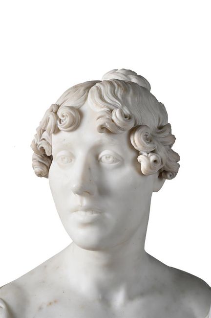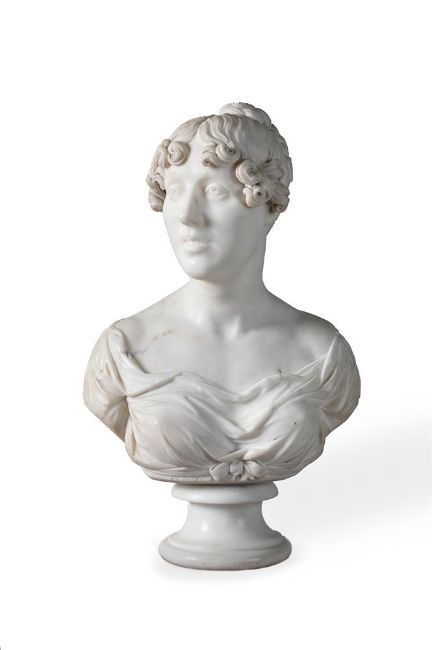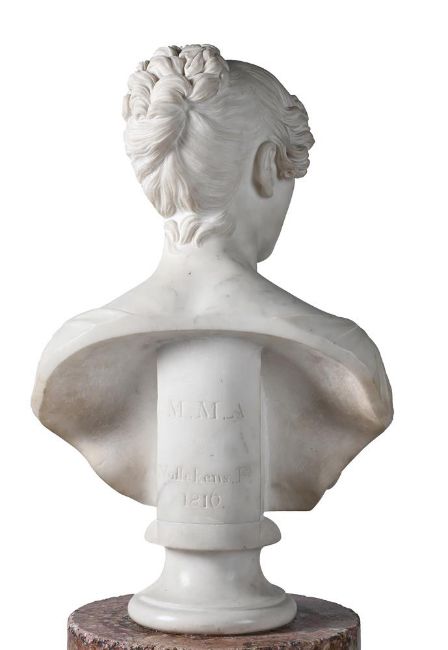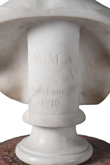 ‡  AFTER JOSEPH NOLLEKENS (1737-1823) A WHITE MARBLE PORTRAIT BUST OF A LADY 'M.M.A' DATED 1816 With signature and date to reverse and inscribed "MMA"- possibly for a Mrs Arkwright approximately 65.5cm high Provenance: This bust is recorded on the Henry Moore Foundation works database as having been purchased by Feigen in Amsterdam, November 1985 where it is thought the possible identification of the sitter was made Condition Report: With some wear from handling and age. Tip of nose and extremities with handling rub, natural flaws, inclusions and darker veining. Some of the inclusions have blistered leaving small pock marks to surface, most notably around her left breast- one to her true right eyebrow looks to have taken a small knock. Under UV spot stains and marks. Hair and recesses with engrained dirt. Some wear around margins and to base. Please see additional images for visual references to condition which form part of this condition report. All lots are available for inspection and Condition Reports are available on request. However, all lots are of an age and type which means that they may not be in perfect condition and should be viewed by prospective bidders; please refer to Condition 6 of the Conditions of Business for Buyers. This is particularly true for garden related items. All lots are offered for sale "as viewed" and subject to the applicable Conditions of Business for Buyer's condition, which are set out in the sale catalogue and are available on request. Condition Report Disclaimer