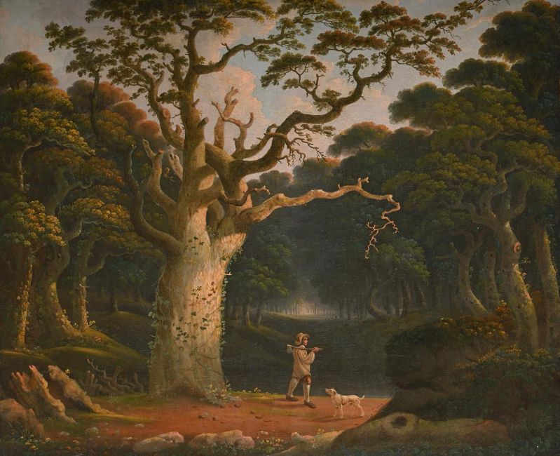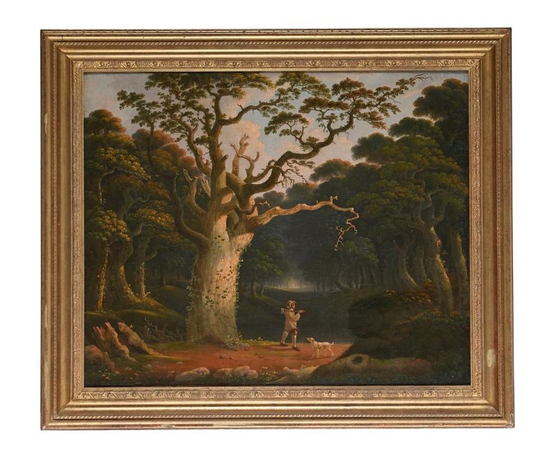 JOSHUA SHAW (ENGLISH 1776-1860) A WOODCUTTER AND HIS DOG IN A GLADE Oil on canvas 61 x 76cm (24 x 29¾ in.) Provenance: Sale, Christie's, 14 October 1988, lot 68 (unsold) Condition Report: Canvas appears to be relined and presents a subtle craquelure across the whole surface as well as a few damages to the edges. UV light reveals scattered retouching to the branches of the tree at the centre, most notably to the biggest branch to the right. An approx 5cm vertical restoration is present to the right of the man, as well as a horizontal restoration of appox 6cm to the right border, a diagonal 5cm retouching in the top left corner. The retouching's conceal what must have been two tears. Finally, meticulous restoration to the foliage in the lower right corner as well as around the figure at the centre. Condition Report Disclaimer