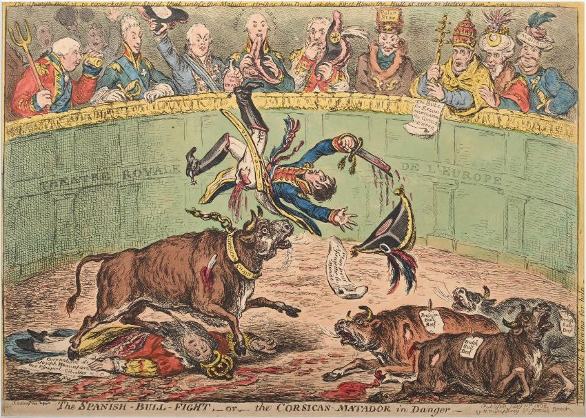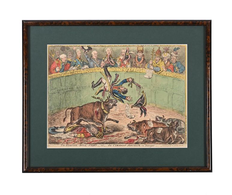 JAMES GILLRAY (BRITISH 1756-1851) THE SPANISH BULL FIGHT OR THE CORSICAN MATADOR IN DANGER Etching with original hand-colouring Published by Humphrey, London, 1808 Sheet: 25.5 x 35cm (10 x 13¾ in.) Literature: British Museum Satires 10997 Condition Report: The sheet is not laid down but stuck to the mount at the corners. The sheet has discoloured overall from acidic housing. The work has been trimmed to beyond the plate mark. Condition Report Disclaimer