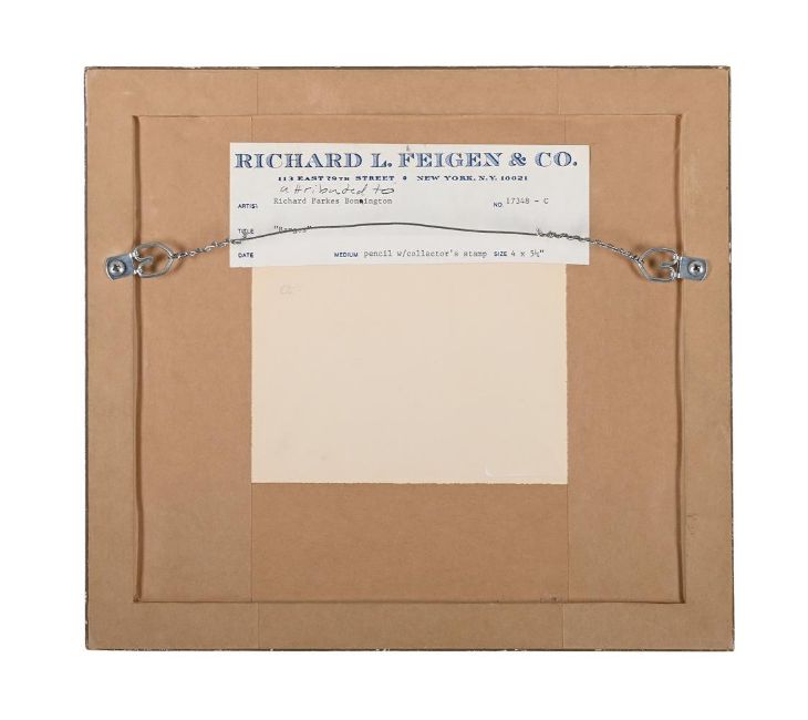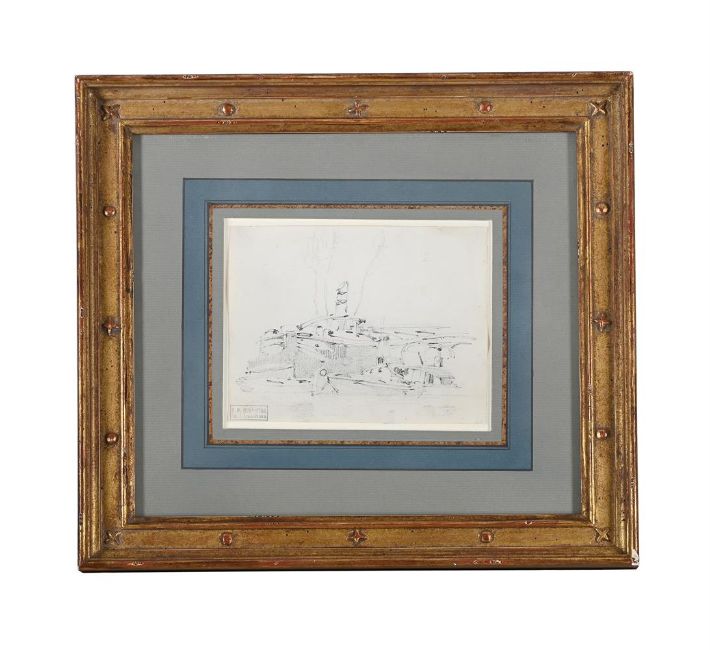 CIRCLE OF RICHARD PARKES BONINGTON (BRITISH 1802-1828) BARGES Pencil With Col. J. Lewis Brown collector's stamp (lower left) 10.5 x 13.5cm (4 x 5¼ in.) Provenance: John Lewis Brown, a gift from the artist to John Lewis Brown's Uncle and by descent to Louise Lewis Brown, his daughter Jean Dieterle and by descent until Sale, Sotheby's, London, 21 November 1991, lot 33 (part lot)This drawing was part of a large group of sketches from the Dieterle collection which were sold Sotheby's 21 Nov 1985 lots 22-33. Their provenance can be traced back to the artist John Lewis Brown (1829-1890) through to his niece Louise Lewis Brown by whom the collector's stamp (L.307d) was added circa 1890-1892. Condition Report: The sheet is not laid down but attached to the mount at the corners. It is in good overall condition and there is a repaired nick to the extreme upper edge. There is some light discolouration but the pencil work is strong. The drawing is fitted into conservation housing an could be hung without further attention. The drawing was not removed from the frame in the preparation of this report. Condition Report Disclaimer