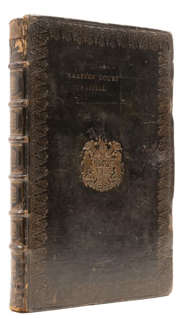 θ Royal binding.- Book of Common Prayer (The), and Administration of the Sacraments ..., ex-Hampton Court Chapel copy, TLs from the press officer at Buckingham Palace loosely inserted, ruled in red, double-column, 2D4 with slight fraying to bottom edge, light staining to top edge (not affecting text), occasional light spotting, contemporary black morocco, King George II's coat of arms to board centres, "Common Prayer Book 1746" partially faded in blind to upper cover, "Hampton Court Chappell" in gilt to upper cover partially obscuring title given in blind, wide outer wave gilt border with floral motifs, 6 raised spine bands, cypher of King George II in gilt to spine compartments, mostly lacking from spine head, now with old repair, rubbed and scuffed, folio, by Joseph Bentham, 1745.
