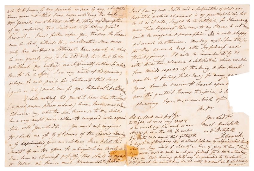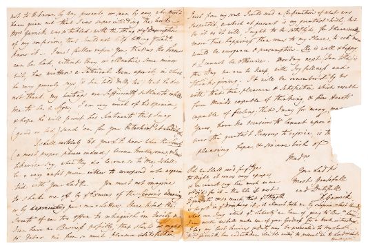 Garrick (David, actor and playwright, 1717-79) Autograph Letter signed to Dorothy Boyle, countess of Burlington, 3pp. & address panel, no place, 9th September 1749, relating an anecdote, "I was at London... I had some Business to do in ye Strand... I was walking along, I saw a number of People got together about a Bookseller's shop. My curiosity lead me to make one & I just came as a man was getting up a Ladder to hang on a Sign for the Shop, which was new and fitted up very handsomely. I jostled in amongst the Crowd to see whose head had the honour of being Exalted; when behold, I saw my own, & my name written about it, in Letters as Tall as Myself. You may imagine I was much disconcerted to be thus caught; however I slunk away as fast as I could...", good remains of red wax seal (cracked), small tear where opened, 3 small tears along folds, remains of tape at head and tail of letter, slightly browned.