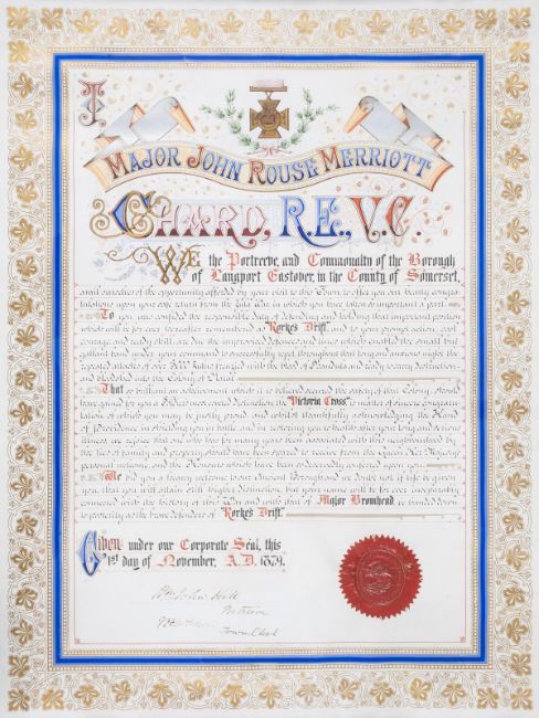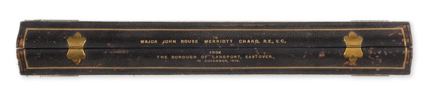 Rorke's Drift.- Chard (John Rouse Merriott, Royal Engineers, V.C., 1847-97).- Illuminated address presented by "The Borough of Langport, Eastover [Somerset], 1st November, 1879", manuscript on vellum, framed and glazed, 570 x 435mm., 1879; and the original silk-lined presentation case, 1879, v.s. (2).
