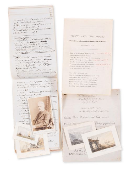 θ Shakespeare.- Roget (John Lewis, art historian, son of the originator of the thesaurus, 1828-1908) [Journal of an art tour to Holland, Belgium and Paris], manuscript notes, 102pp. excluding blanks (87pp. Journal and 15pp. expenses), 7 pieces of ephemera loosely inserted including including a cabinet photograph of Roget, an autograph manuscript of “The Three Witches” adapted from Shakespeare, and “Time and the Hour: A Patchwork Poem in Shakespeare’s Words” printed with some side notes in ink, both by Roget, original marbled boards, paper label with manuscript title on upper cover, a few ink doodles on both boards, spine defective, 200 x 125mm., 1872.