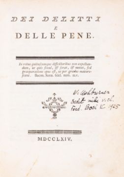 ⁂ Rare and important anonymously written work on crime and punishments. "One of the most influential books in the entire History of Criminology [...] Beccaria maintained that the gravity of the crime should be measured by its injury to society and that the penalties should be related to this. The prevention of the crime he held to be of greater importance than its punishment...He denounced the use of torture and secret judicial proceedings. He opposed capital punishment, which should be replaced by life imprisonment...and the conditions in prisons should be radically improved... [his] ideas have now become so commonplace that it is difficult to appreciate their revolutionary impact at the time" (PMM).