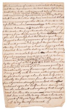 ⁂ White's statement on the venomous properties of the toad and with a series of thermometer readings. Editor Thomas Bell describes as "Gilbert White's statement" on the venomous properties of the toad, first printed in a footnote (signed 'T. B.') on pp.51-52 of the first volume of Bell's 1877 edition of The Natural History of Selborne (London: John Van Voorst, 1 Paternoster Row). The following note by Bell, prefixed to White's "statement", indicates the significance Bell placed upon it, and the circumstances of its composition: "The habit of close observation of nature which was so conspicuous in White himself was communicated by his example to many who came within the sphere of his influence... . The following account, which I find amongst his papers, is a striking example of this. The observer was doubtless no other than his old gardener, Thomas Hoar, a quaint original, who was many years in his service. The account is not in White's handwriting, but evidently written from his dictation, as it is in a boy's hand, and has several verbal corrections, and the diction is his own." The present manuscript text of White's 'statement' - corresponds to the 1877 printed version in all but accidentals: it is not in White's handwriting, but in "a boy's hand"; it has "several verbal corrections", and the diction is White's own. The layout of the "statement" is, in addition, very similar to that of the original manuscript of the Natural History, suggesting the possibility that the leaf it is written on once formed part of it. Two factors reinforce the impression that the document was used by a printer. Firstly, in pencil, at the head of the page, is written "Copied & printed". Secondly, added in ink at various points in the document are what appear to be two printer's marks: first, a symbol of a dot in a circle, repeated once; and another symbol of a square with a central vertical line through it, also repeated once. On the reverse of the document are thermometer readings which White is known to have carried out on a daily basis.
