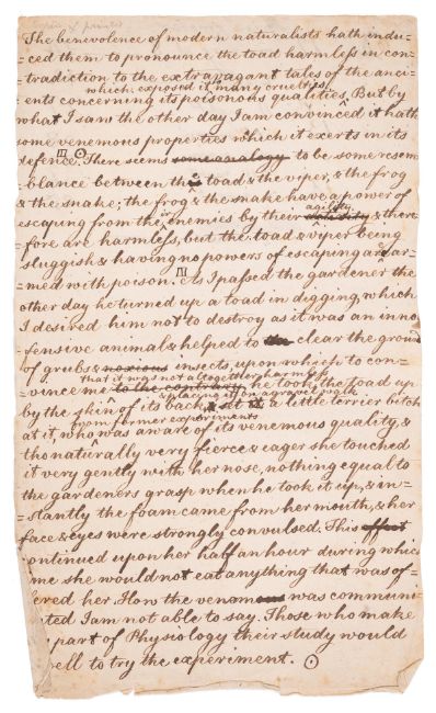θ Venomous toads.- White (Rev. Gilbert, naturalist, author of the "Natural History of Selborne", 1720-93) "The benevolence of modern naturalists hath induced them to pronounce the toad harmless...", manuscript in a juvenile hand probably written at White's dictation, together 2pp., first page statement by White with eleven corrections in the text, watermark royal coat of arms, fold, browned, edges slightly creased and chipped, folio, n.d. [18th century].