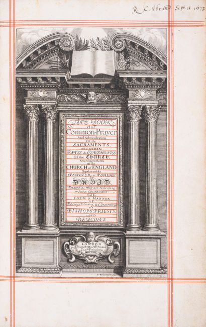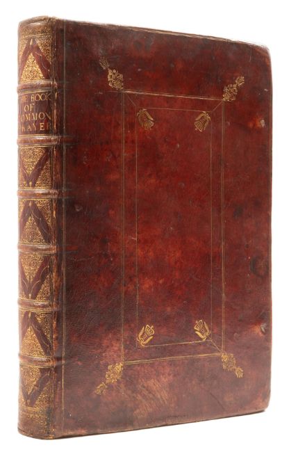 θ Royal Binding.- Book of Common Prayer (The), engraved title, wood engraved initials, head- and tail-pieces, ruled in red throughout, additional engraved portrait of King Charles II mounted on thin card and loosely inserted, b4 with small marginal loss, A3 with loss to corners, N3 with tiny rust-hole affecting odd letter, 2F3 with tear into text and no loss, occasional light soiling, early ink signature of Richard Colebrand to title and A1, contemporary red morocco by ?Samuel Mearne, central gilt panels with cypher of King Charles II to corners comprising two 'C's back-to-back between two palm leaves and surmounted by a crown, richly gilt spine, a little rubbed, bumping to corners and extremities, lacking ties, folio, by His Ma:ties Printers, 1669.