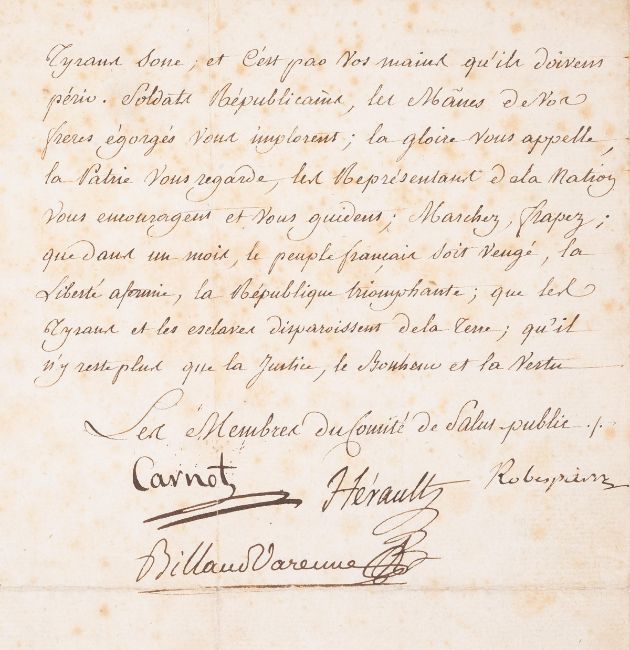 Robespierre (Maximilien François Marie Isidore de), French lawyer, statesman, and leading figure in the Revolution, 1758-1794) Les Representans du Peuple composans le comité de salut public à l'Armée, scribal copy of a triumphant address to the army on Republican victories, 2pp., signed by Robespierre, and also by Lazare Carnot, Herault de Sechelles and Jacques Billaud-Varenne as members of the Comité de Salut public, foxed and lightly browned, folio, dated in another hand '2 Brumaire', [October, 1793].