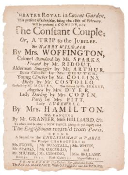 θ Georgian Irish actress & socialite.- Theatre Royal, Covent Garden. This present Wednesday, being the 18th of February, will be presented a Comedy call'd The Constant Couple; or a trip to the Jubilee. Sir Harry Wildair by Mrs. Woffington, printed playbill, folds, some fraying to edges, little spotting, lightly browned, 250 x 180mm., no printer, [1756].