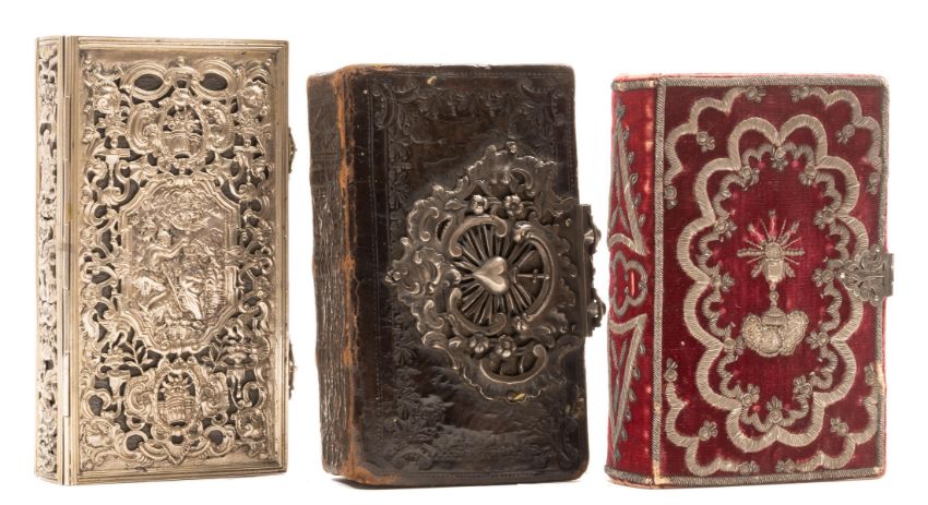 θ Bindings.- Book of Common Prayer (The), faint creasing to fore-edges of first and last few ff., cracked hinges, contemporary latticework silver binding with clasps, lacking hallmarks but tests as silver, central image showing baptism of Jesus to upper cover and the Ascension to the lower cover, Oxford, at the University Press, [late nineteenth century] § El Diamante de Cristano, half-title, plates, scattered spotting, silken endpapers, contemporary red velvet with silver filigree decoration, silver metal clasp engraved A. L., a little rubbed in places, Barcelona, 1851; and an eighteenth century German prayer book bound in contemporary calf with an elaborate silver metal clasp, 12mo (3)