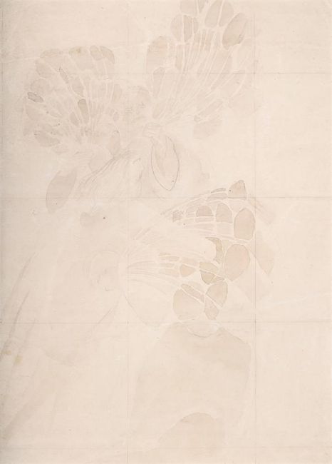 λ SIR STANLEY SPENCER (BRITISH 1891-1959) STUDY FOR FEEDING THE FIVE THOUSAND Pencil and ink, squared for transfer 49 x 35cm (19¼ x 13¾ in.)Drawn circa. 1921. Provenance: From the Estate of Sir Stanley Spencer This study shows the central figure of Christ blessing the bread. The shapes of the bread containers were suggested by canvas water buckets which Spencer saw during his war service in Macedonia.