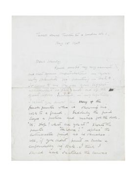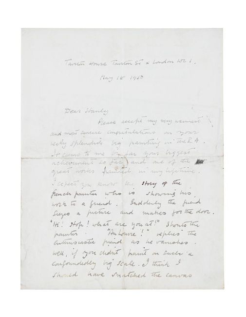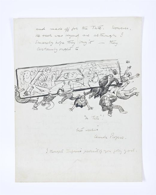 λ CLAUDE ROGERS (BRITISH 1907-1979) LETTER FROM CLAUDE ROGERS TO STANLEY SPENCER Ink Dated May 18 1950 (to front of sheet), sketch illustrating Stanley Spencer's painting on view at the Royal Academy being removed from the wall to be sent 'Au Tate!' (verso) 22.5 x 18cm (8¾ x 7 in.) UnframedProvenance: From the Estate of Sir Stanley Spencer