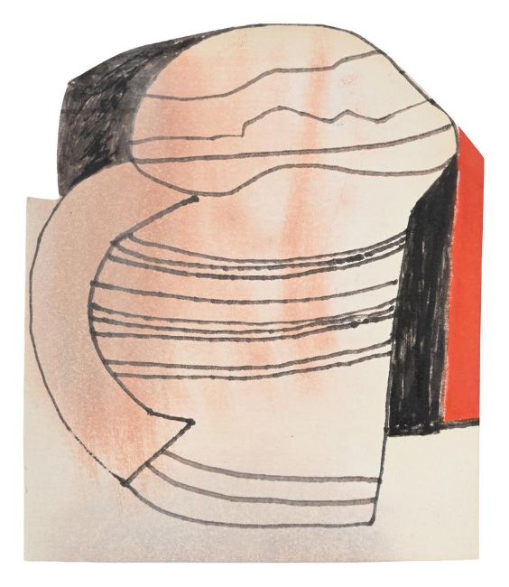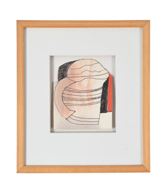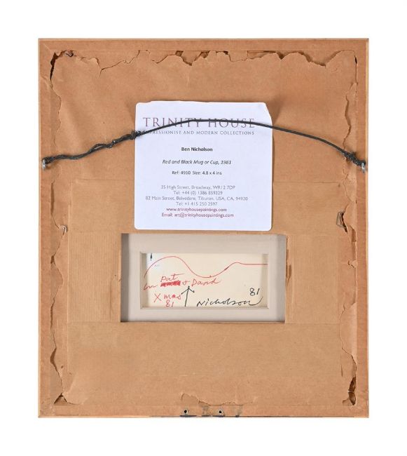 λ BEN NICHOLSON (BRITISH 1894-1982) RED AND BLACK JUG Ink and gouache on paper Signed, dedicated and dated to Pat & David Xmas 81 (verso) 12 x 10.5cm (4¾ x 4 in.) (irregular)Provenance: Private Collection, Patricia Lewis (a gift from the artist. Pat and her former husband David Lewis (1922-2020) were close friends of the artist and at one time David was studio assistant to Barbara Hepworth and married to the artist Wilhelmina Barns-Graham) Her sale, Concept Art Gallery, Pittsburgh, 2 June 2018, lot 1255 Acquired from the above by the present owner Condition Report: Unexamined out of glazed frame. The work is hinged to the mount verso. The sheet appears slightly discoloured and is slightly curled at the edges. Otherwise, in generally good condition.Condition Report Disclaimer
