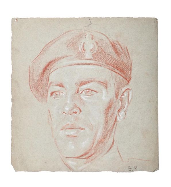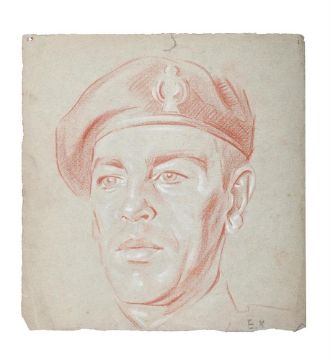 λ ERIC KENNINGTON (BRITISH 1888-1960) STUDY OF A SOLDIER Red chalk heightened with white Signed with initials (lower right) 25 x 24cm (9¾ x 9¼ in.) UnframedIn August 1940, the War Artists Advisory Committee, offered Eric Kennington a full-time role to work for the air ministry and he produced over a hundred portraits of aircrew and pilots including Squadron Leaders Douglas Bader, Roderick Learoyd and Adolph Malan. Traveling around the UK he drew the military personal of not only the RAF but also the Army, spending time with the 11th Armoured Division in Yorkshire. Kennington recognised the bravery and heroism of everyone that played their part, capturing the individual character of all that sat for him. From Squadron Leaders to office clerks, he approached every portrait with the same reverence and respect. Condition Report: Light surface dirt. A small tear to the centre of the upper edge. Small holes to the upper corners where it would have previously been pinned. Handling creases to the lower corners and both extreme corners folded. Condition Report Disclaimer