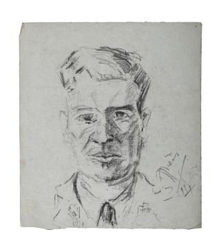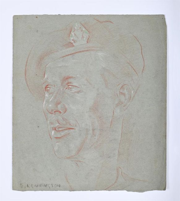λ ERIC KENNINGTON (BRITISH 1888-1960) STUDY OF A SOLDIER Red chalk, heightened with white Signed (lower left) 27.5 x 24cm (10¾ x 9¼ in.) Unframed Study of a gentleman, verso. In August 1940, the War Artists Advisory Committee, offered Eric Kennington a full-time role to work for the air ministry and he produced over a hundred portraits of aircrew and pilots including Squadron Leaders Douglas Bader, Roderick Learoyd and Adolph Malan. Traveling around the UK he drew the military personal of not only the RAF but also the Army, spending time with the 11th Armoured Division in Yorkshire. Kennington recognised the bravery and heroism of everyone that played their part, capturing the individual character of all that sat for him. From Squadron Leaders to office clerks, he approached every portrait with the same reverence and respect. Condition Report: Light surface dirt throughout. Pin holes to the upper corners. Lower edge slightly uneven. Condition Report Disclaimer
