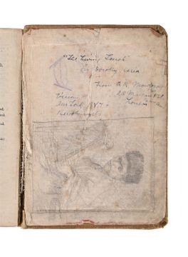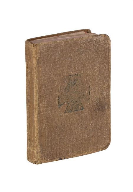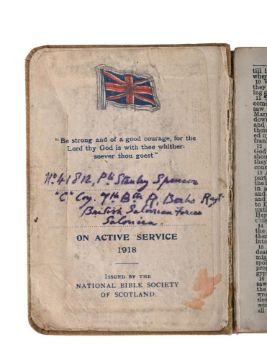 STANLEY SPENCER'S BIBLE, 1918, 9th battalion, Royal Berkshire Regiment, British Salonika Forces, whilst on active service. To include a number of foreign stamps and sketch titled 'The Living Touch' in pencil, to the back page of the book by an unknown hand, 10 x 7.5cm (4 x 3in.) Provenance: From the Estate of Sir Stanley Spencer