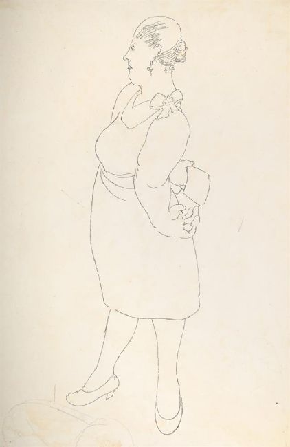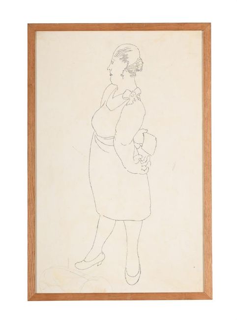 λ SIR STANLEY SPENCER (BRITISH 1891-1959) THE HOTEL KEEPER'S WIFE, STUDY FOR CHRIST PREACHING AT COOKHAM REGATTA Pencil 66 x 42cm (25 x 16½ in.)Provenance: From the Estate of Sir Stanley Spencer Exhibited: Cookham, Stanley Spencer Gallery, That Marvellous Atmosphere, Stanley Spencer and Cookham Regatta, 3 April-2 November 2025 Please note this present work is currently included in That Marvellous Atmosphere, Stanley Spencer and Cookham Regatta held at the Stanley Spencer Gallery in Cookham running until 2nd November. It is at the buyer's discretion whether they would like to return the piece for the remainder of the exhibition. The department will contact the buyer following the auction. The present lot is a study for Christ Preaching at Cookham Regatta executed between 1952-1959 but never completed. The work depicts Christ preaching to the villagers of Cookham beside the Ferry Hotel and Cookham Bridge. The Hotel Keeper's Wife can be seen to the right side of the composition.