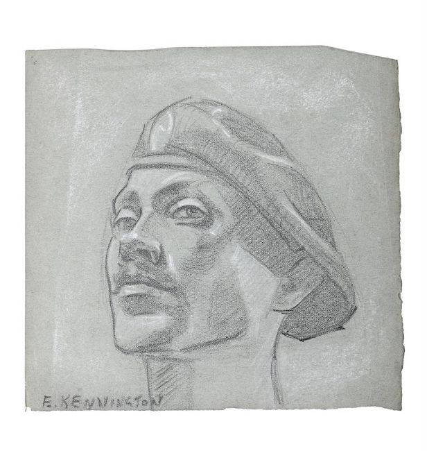 λ ERIC KENNINGTON (BRITISH 1888-1960) PORTRAIT OF A SOLDIER Pencil and chalk Signed (lower left) 23 x 24cm (9 x 9¼ in.) UnframedIn August 1940, the War Artists Advisory Committee, offered Eric Kennington a full-time role to work for the air ministry and he produced over a hundred portraits of aircrew and pilots including Squadron Leaders Douglas Bader, Roderick Learoyd and Adolph Malan. Traveling around the UK he drew the military personal of not only the RAF but also the Army, spending time with the 11th Armoured Division in Yorkshire. Kennington recognised the bravery and heroism of everyone that played their part, capturing the individual character of all that sat for him. From Squadron Leaders to office clerks, he approached every portrait with the same reverence and respect. Condition Report: Sheet with uneven edges. Folder to the upper right corner. Cluster of pin holes to the upper left corner. A small loss to the lower left corner. Diagonal crease running down the right edge of the sheet. Condition Report Disclaimer