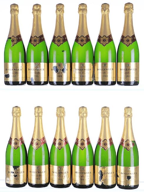 1983 Bollinger, La Grande Annee 12x75cl Good colour, all 1.5cm inverted ullage, labels damp-soiled and damaged. Previously owned by a winner of the Blue Marlin World Cup. As an International Angling Champion and avid wine collector, he was sponsored by Bollinger in the 1990s and had the prestigious opportunity to purchase most of his wines directly from the respective houses.