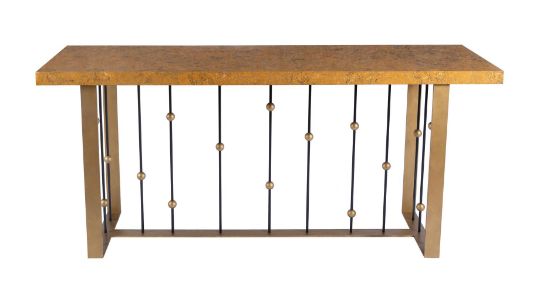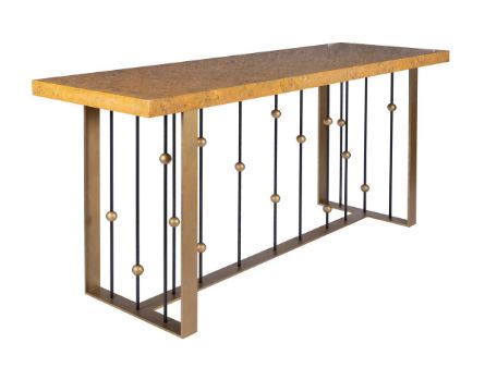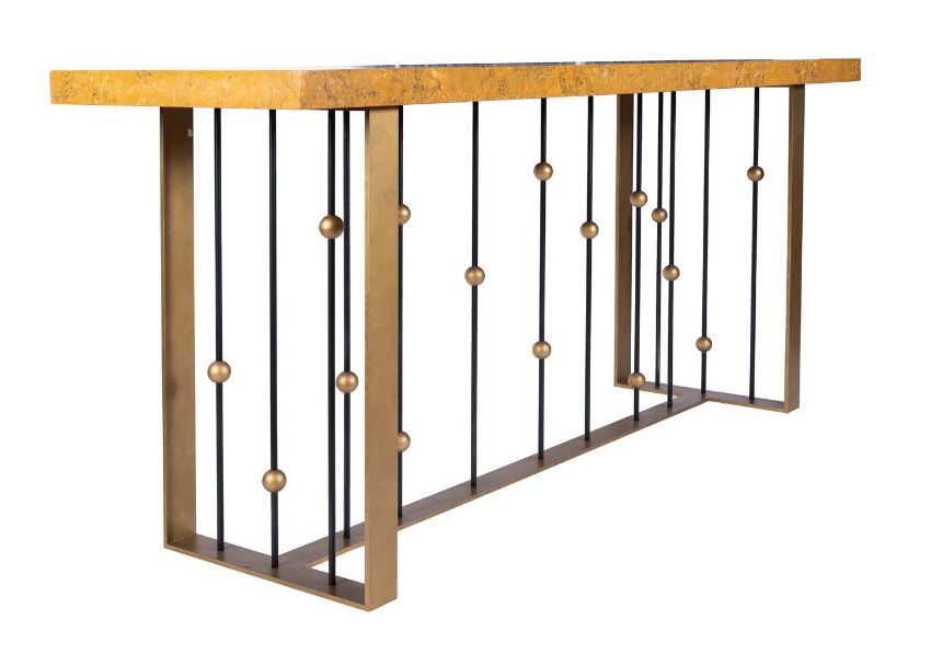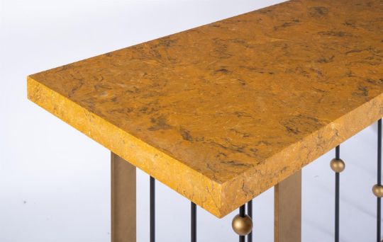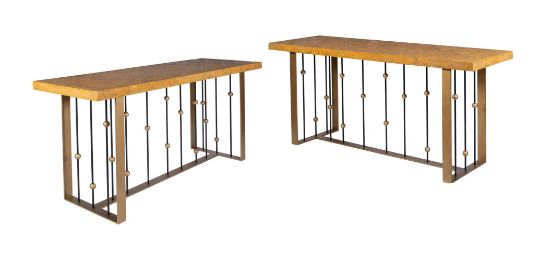 A PAIR OF BRASS AND MARBLE VENEERED SIDE TABLES DESIGNED BY PETER MIKIC, MODERN 90cm high, 200cm wide, 61cm deep   Condition Report: PLEASE NOTE: THIS LOT IS NOT AVAILABLE TO VIEW As stated in the cataloguing this lot is of contemporary make and the condition reflects this Some minor scratches to black metal, please see additional images Countertops are removable for transport The metal frames are 84.5cm high, 116cm wide, 50.5cm deep, the internal width is 146.5cm and the depth from the edge of the counter to the middle of the frame is 26cm The tops are 200cm wide, 60cm deep, 6cm high ADDITIONAL IMAGES: Please 'Ask a Question' to request additional images for this lot.Condition Report Disclaimer