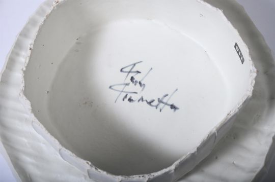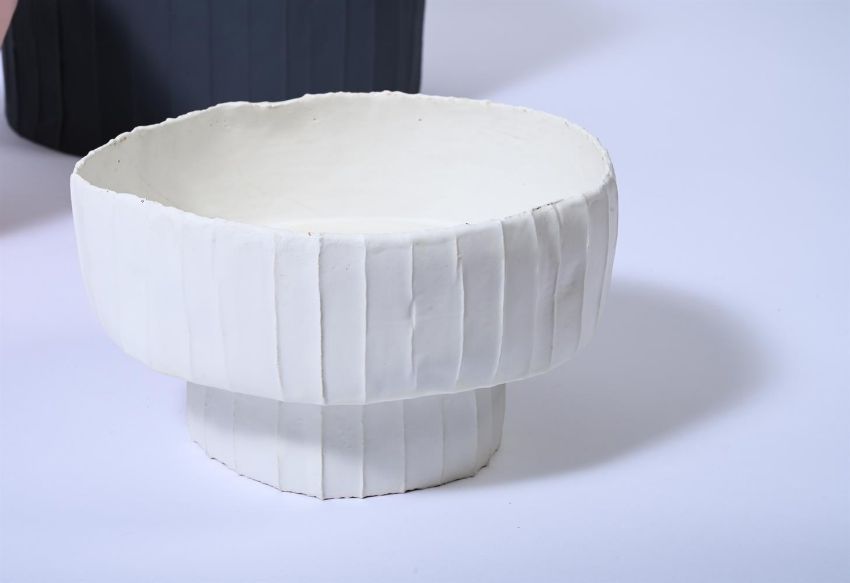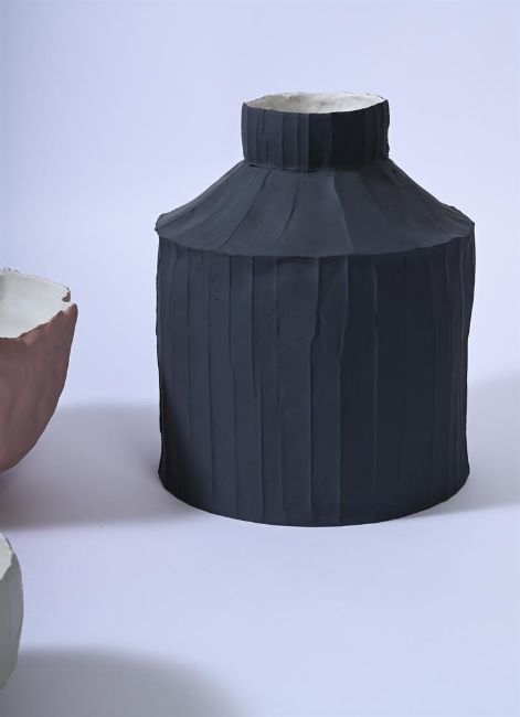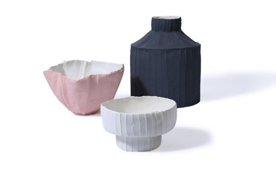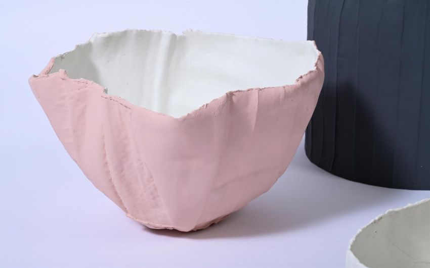 λ  PAOLA PARONETTO (ITALIAN, B.1965) THREE 'PAPER CLAY' CERAMIC ORNAMENTS, MODERN Comprising a grey Fide vase (115), approximately 34cm high, a Coppe Ninfea vase, 12cm high, 21cm diameter and a pink bowl, from the Anemone and Tulipano collection, 17cm high, approximately 28cm diameterProvenance: From the Contemporary Ceramics Centre Paola Paronetto's work is driven by the beauty of nature and the simplicity of forms, both of which are exaggerated through the delicacy of paper clay. Her works are exhibited at some of the most international design events, ADI Design Musem - Compasso d'Oro in Milan hosted her first anthological exhibition in Italy and she also collaborated with Veuve Clicquot at the Milan Design Week in 2023.   Condition Report: With minor wear due to lack of age Small dust deposits to inside of grey vase Pink bowl with minor glazing spots and some wear to base from handling ADDITIONAL IMAGES: Please 'Ask a Question' to request additional images for this lot.Condition Report Disclaimer