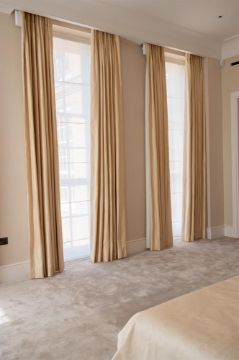 SIX PAIRS OF TAFFETA CURTAINS OF RECENT MANUFACTURE In pale yellow ochre each approximately 330cm drop, 180cm wide Provenance: Purchased from Claremont Furnishings Fabrics Ltd Condition Report: As catalogued this is of contemporary make and the overall condition and appearance reflects this Minor wear from use in a domestic setting, please see additional images A few small areas of wear Covering a distance of 125cmThere are no labels confirming what fabric the curtains are. The fabric, lining and interlining and manufacture are of high quality and the fabric has the appearance of silk taffeta, though this can't be confirmed. The curtains are a soft shimmery yellow, the colour comes across better in the in situ additional images and the images online, than the additional images taken in our saleroom.  This lot is available to view ADDITIONAL IMAGES: Please 'Ask a Question' to request additional images for this lot.Condition Report Disclaimer