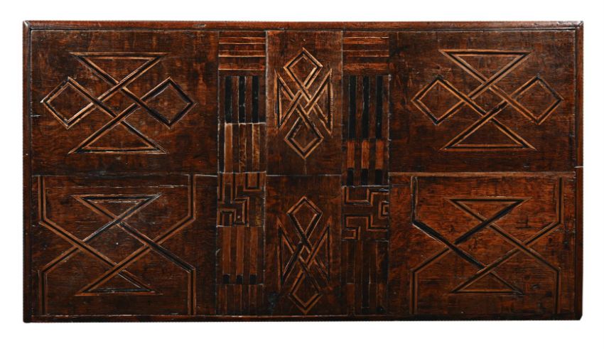AN UNUSUAL GEORGE III OAK AND PARQUETRY CHEST OF DRAWERS