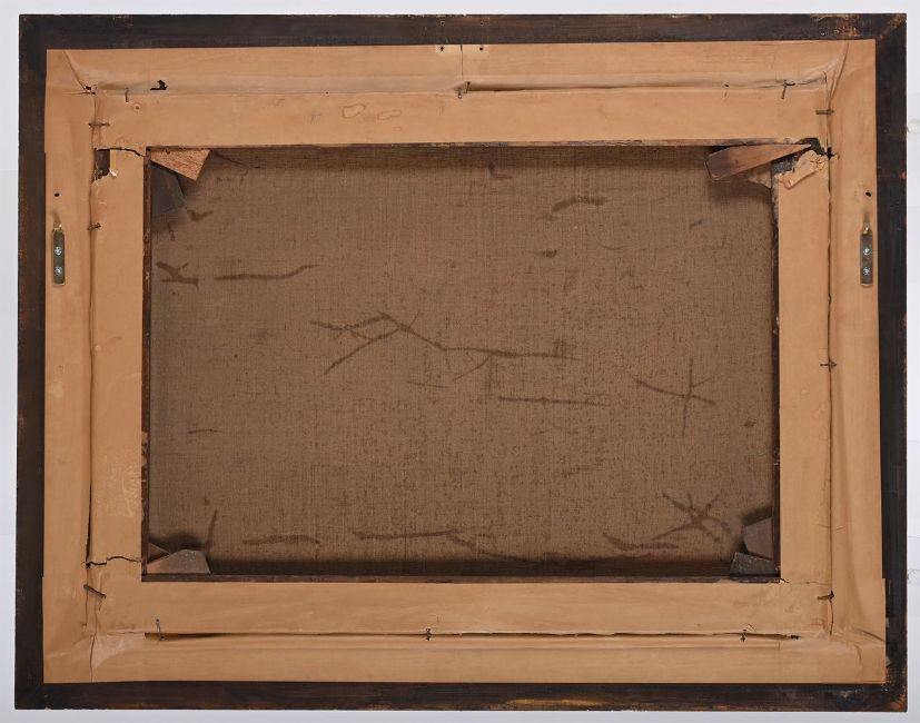 Relined. Patches of craquelure scattered throughout the surface. Evidence of pin holes to the four corners. Evidence of a thick layer of varnish throughout. Inspection under UV reveals no obvious evidence of restoration or repair.