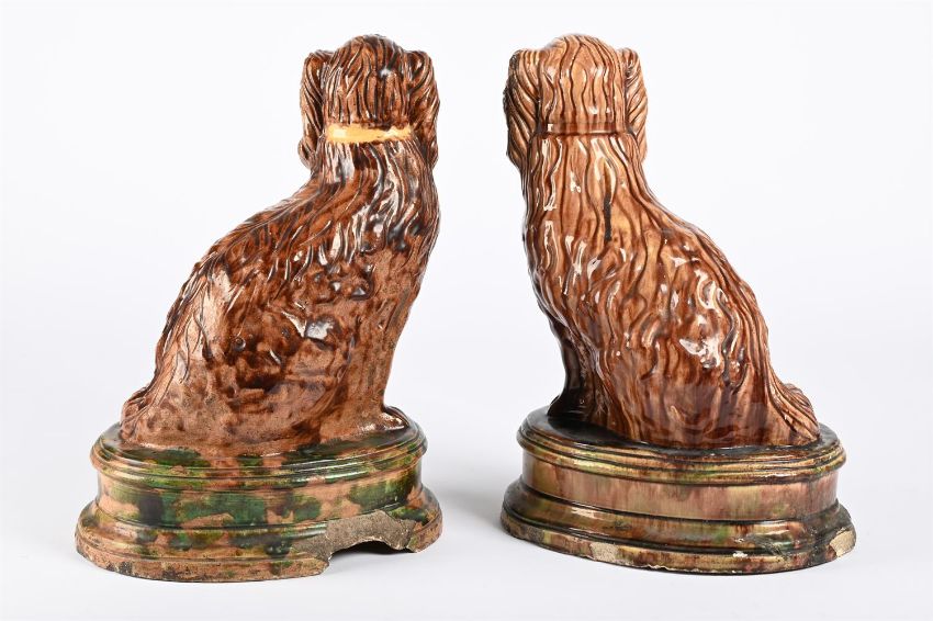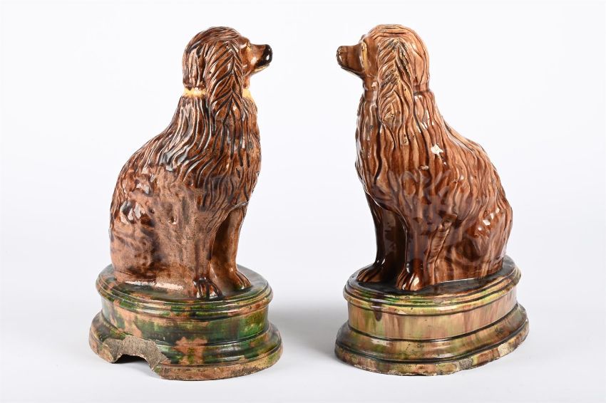 A PAIR OF BRITISH BROWN AND GREEN GLAZED POTTERY MODELS OF SPANIELS