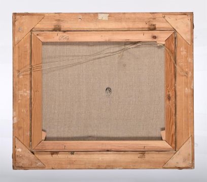 Light surface dirt. A small abrasion with associated paint loss is present approximately 15cm from the left edge and 4cm from the upper edge. The canvas presents two small holes, one approximately 4cm below the centre of the upper edge and the other above the male figure's brown hat. Otherwise, there appears to be no further signs of damage or restoration.