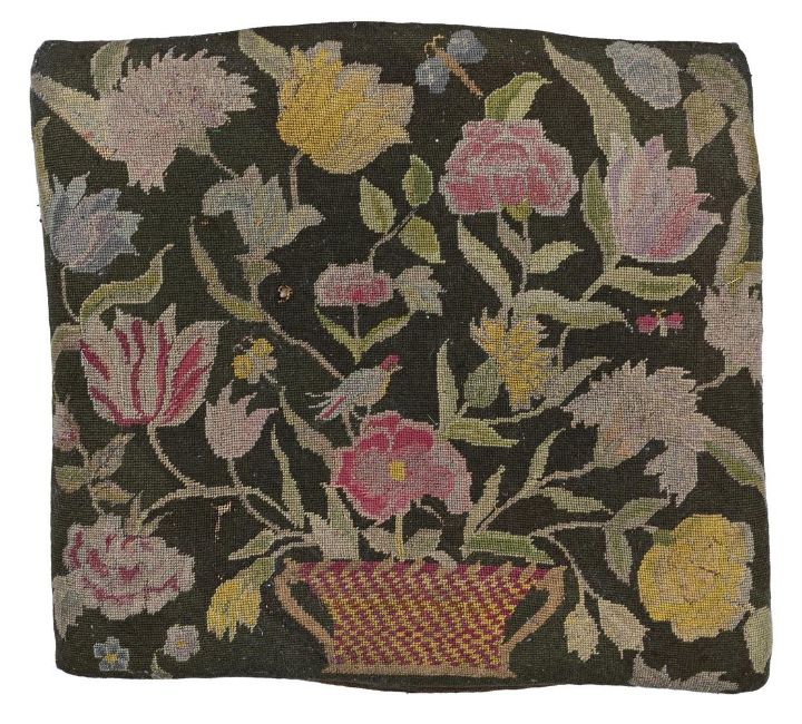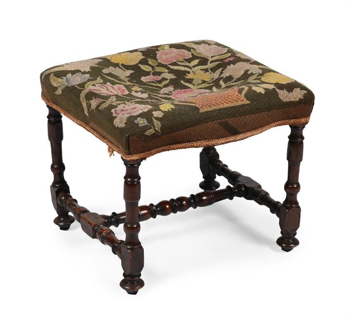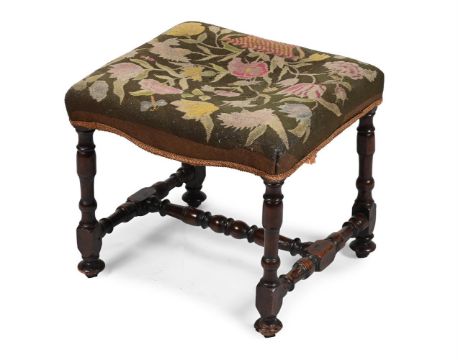 A WALNUT STOOL WITH NEEDLEPOINT UPHOLSTERY