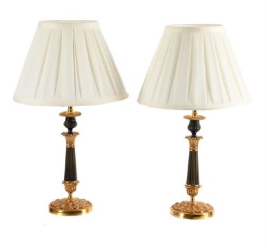 A PAIR OF BRONZE AND GILT CANDLESTICK LAMPS