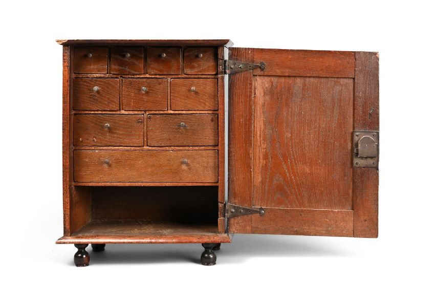 The panel door enclosing an arrangement of small drawers